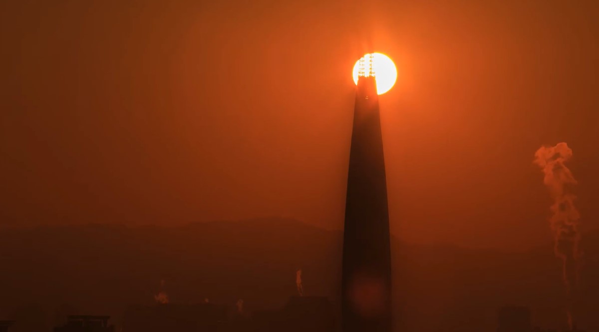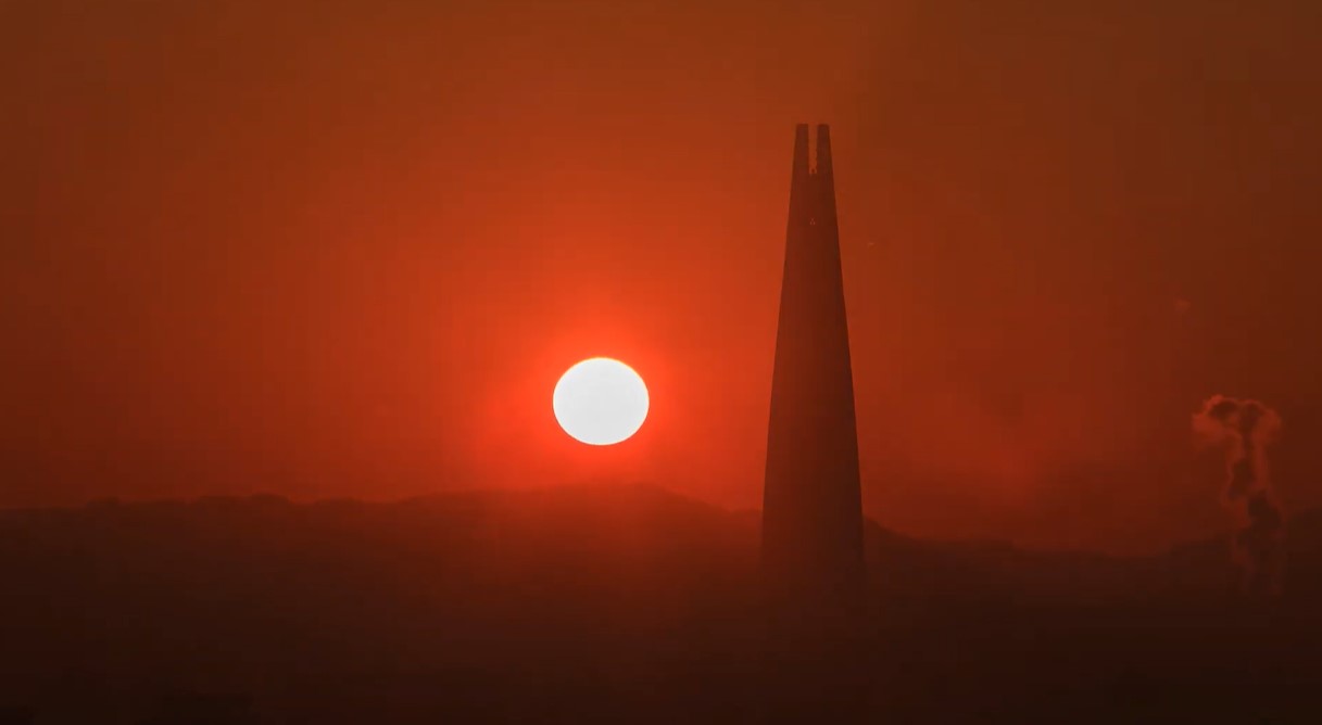 롯데타워 실루엣과 함께 보이는 일출 모습입니다.